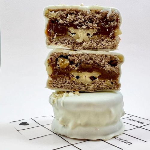 Elaborado con tapas de masa sablée de nueces que aportan una textura crujiente y deliciosa. Relleno con dulce de leche y trocitos de nueces, y bañado en una capa suave de chocolate blanco.