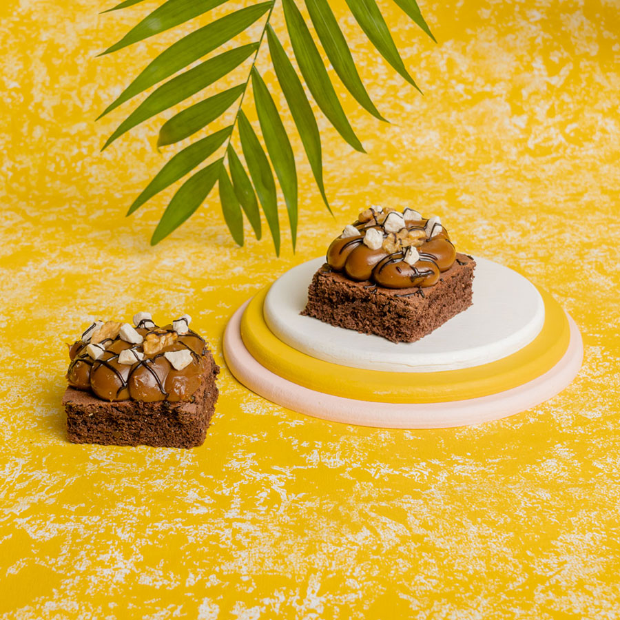 El mejor brownie de chocolate belga sin nueces con dulce de leche, trocitos de merengue suizo seco, nueces y salsa de chocolate.