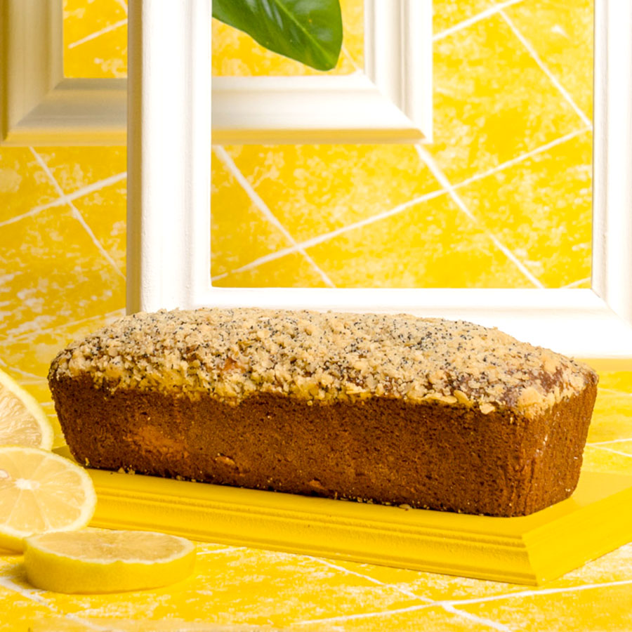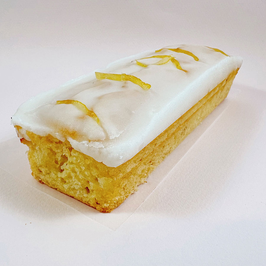 Masa esponjosa y húmeda de limón, decorada con cascaritas de limón confitadas.
