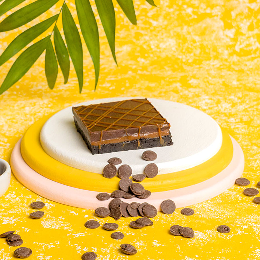 Base de mousse de chocolate cocido, relleno de dulce de leche y cubierta de chocolate 70%.