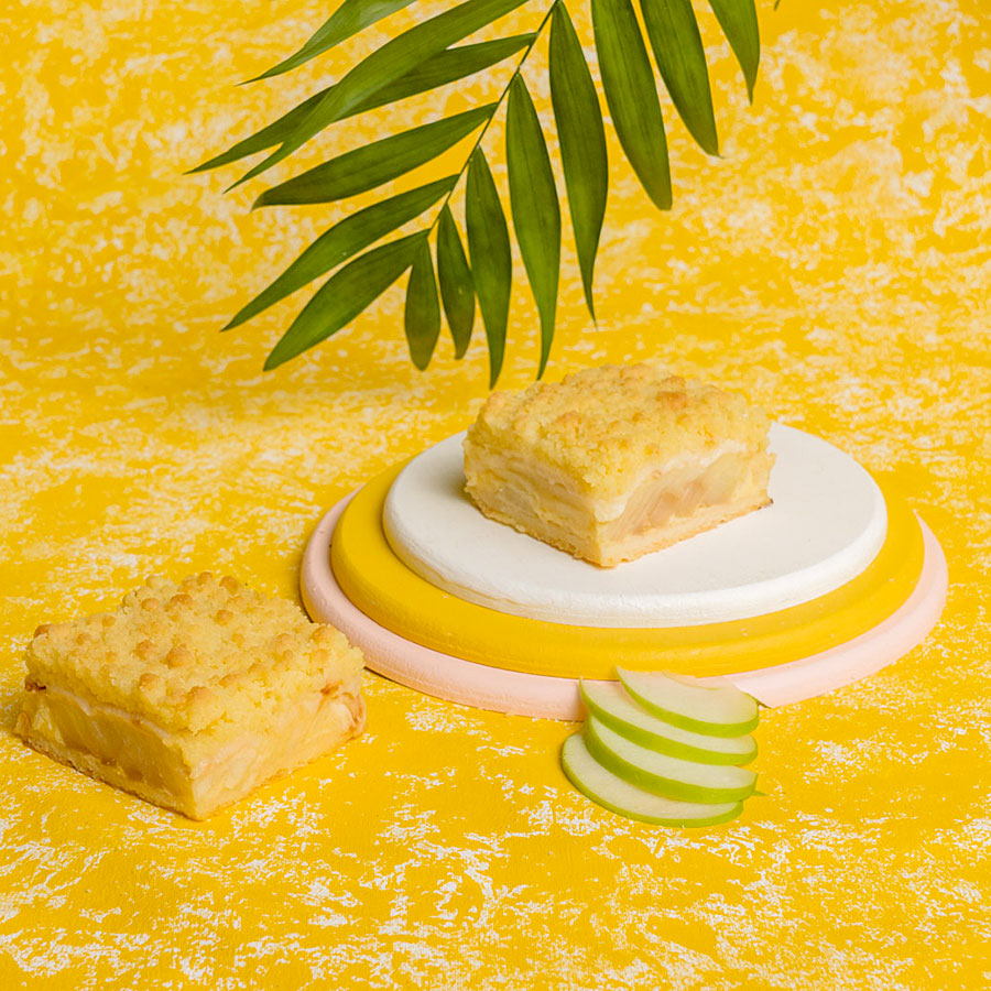 Base sablée, relleno de manzanas ligadas con crema de vainilla y terminada con una capa de Streussel crocante.